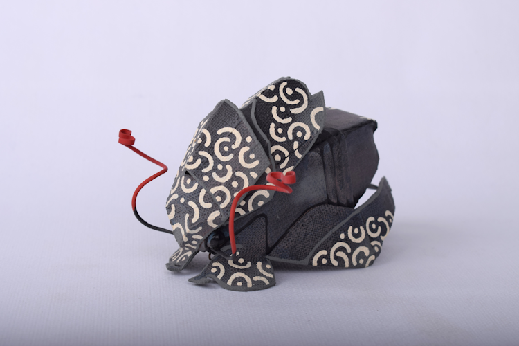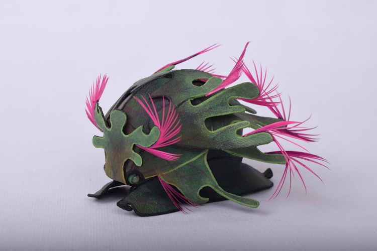 Sarah de Graaf, originally a goldsmith, knows how to use various materials in an exceptionally creative way to make small objects. While she used to be inspired by the world of flowers when making jewelry, she now knows how to touch us with her image of the beauty and fragility of nature. Her fantasy fish and beetles made of worked linen are intense and colorful and the goldsmith’s hand remains visible in the detailed work.